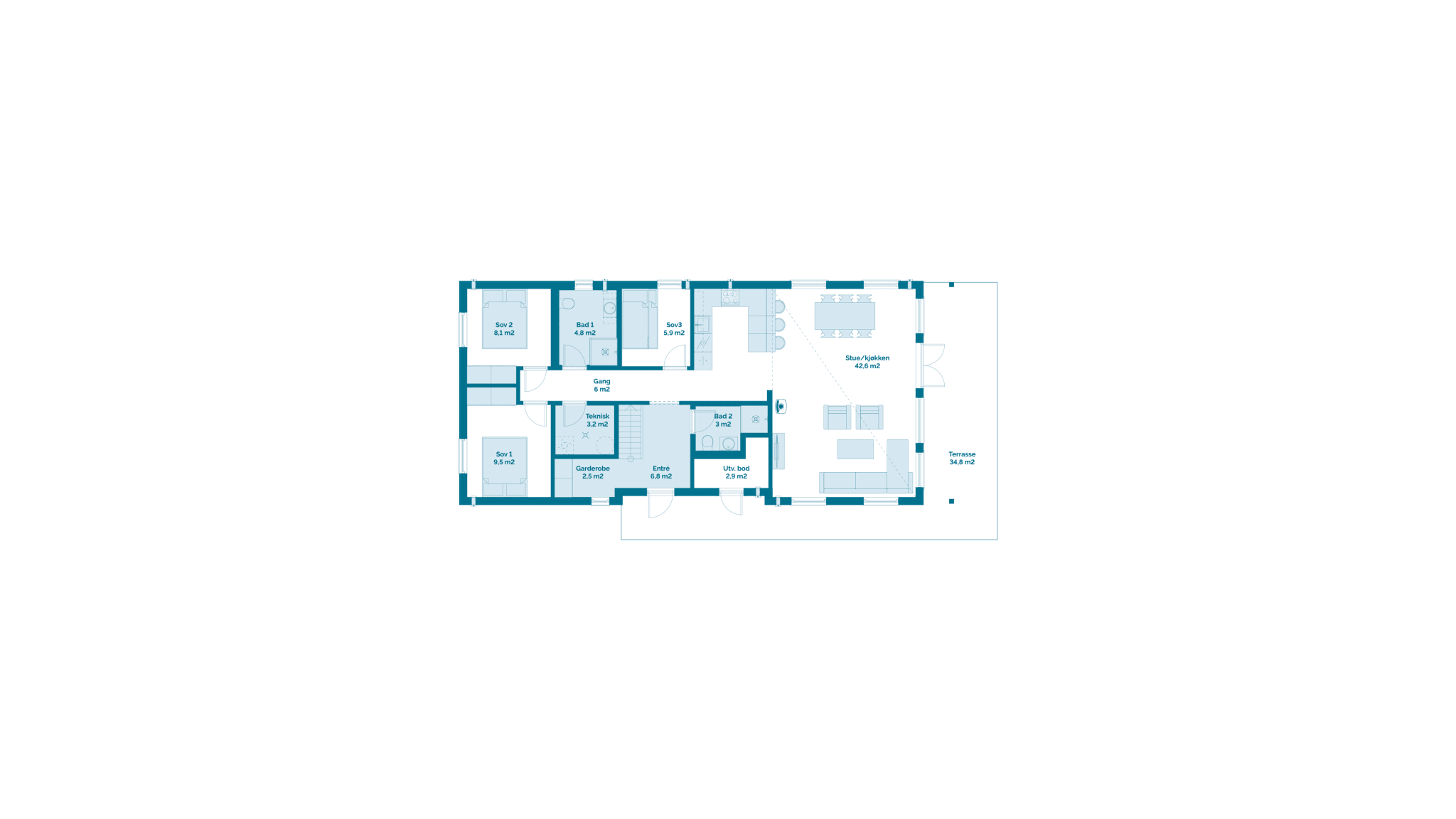 Grunnplan:Stue, kjøkken, 3 soverom, 2 bad, entre, garderobe og utvendig bod.