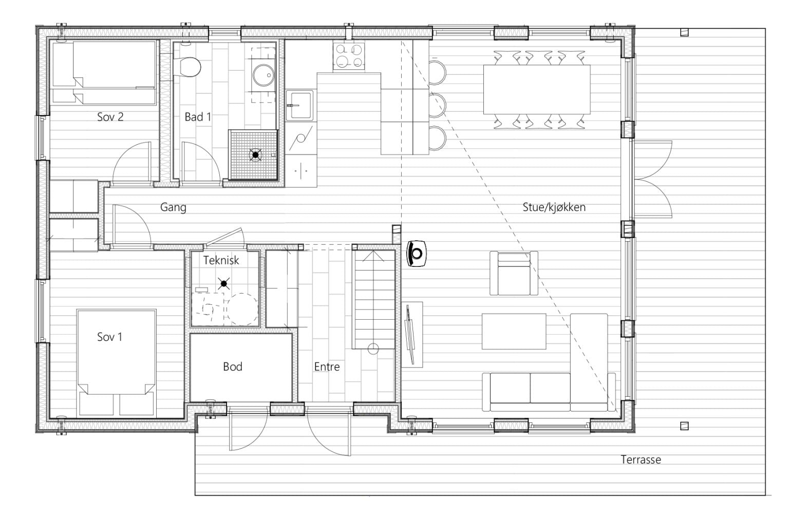 Grunnplan:Stue, kjøkken, 2 soverom, bad, entre, bod/teknisk rom og utvendig bod.