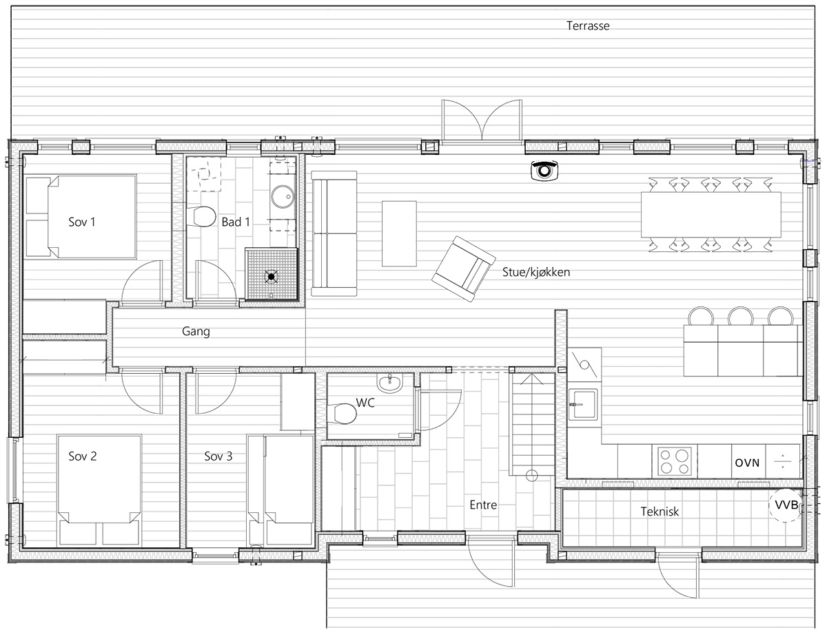 Grunnplan:Stue, kjøkken, spiseplass, 3 soverom, bad/WC, ekstra WC, entré, garderobe, utvendig bod.