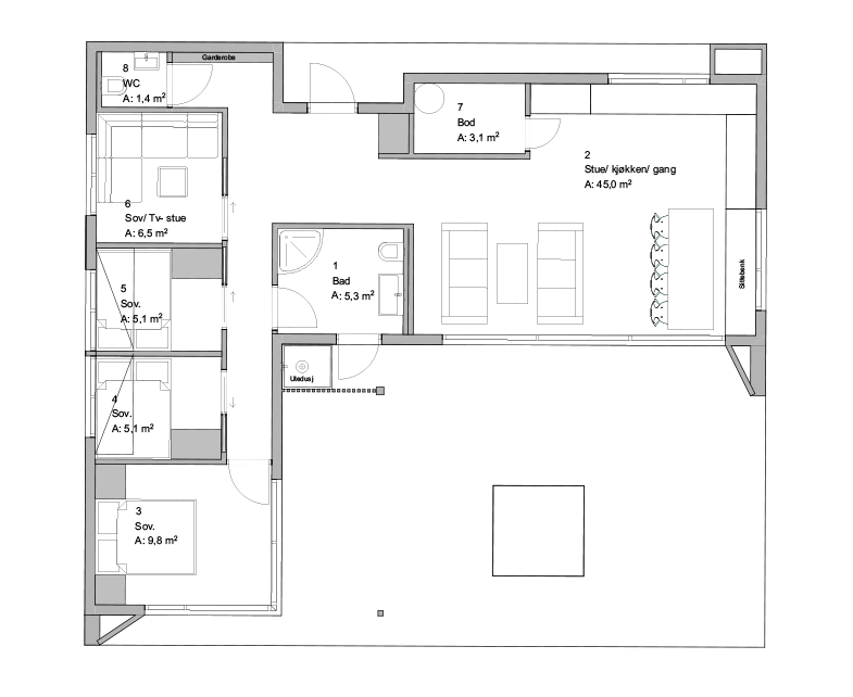 Grunnplan:Stue/kjøkken, 4 soverom (evt. 3 sov og en ekstra stue), bad, ekstra wc og bod